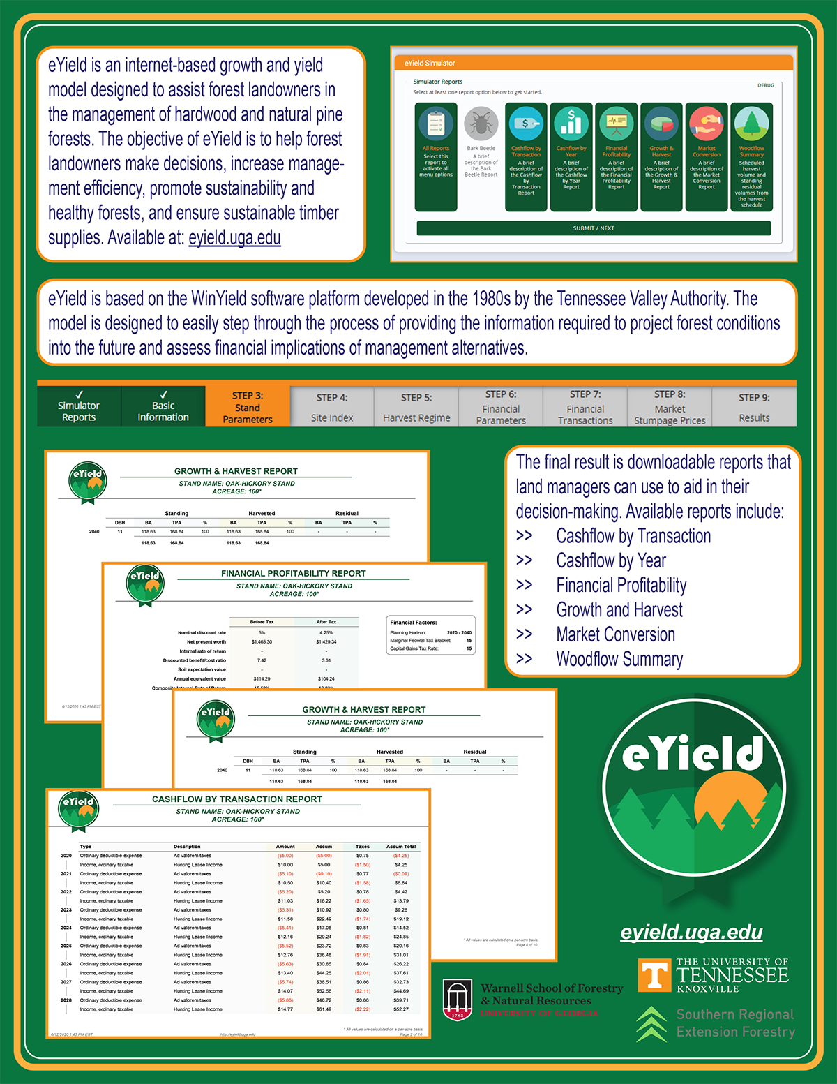 eYield will project forest conditions into the future, assess financial implications of management alternatives, and produce reports that guide forest management. Forest simulators include natural (not planted) loblolly pine, slash pine, shortleaf pine, and longleaf pine, upland oak-hickory, yellow-poplar, and eastern white pine.